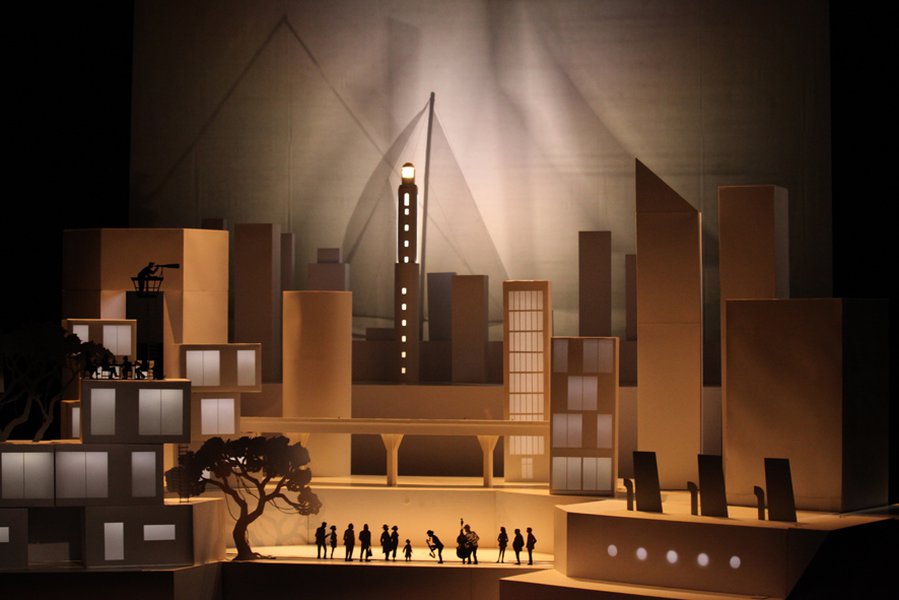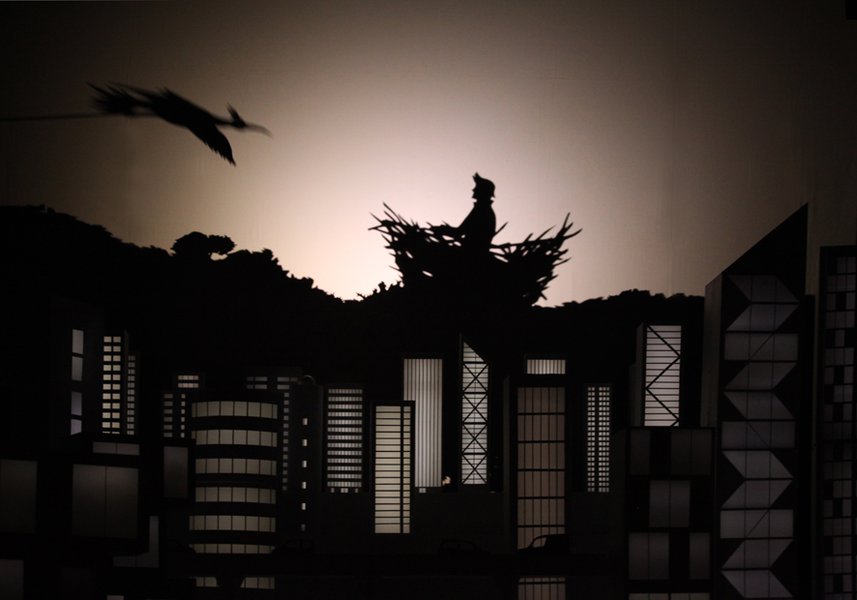Cette histoire est mise en scène dans une maquette spectaculaire animée par des jeux d’ombres et de lumières, terrain de jeu pour quatre marionnettistes et deux musiciens qui entraînent les spectateurs dans cette dérive imaginaire.